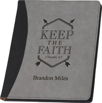 Carry this professional, faux leather padfolio from meeting to meeting, your next job interview, or an out-of-town conference, all while keeping your notes and important paperwork organized. Personalize with a name, image, or company to make it your own. Features an open design for easy access, lined legal pad, pocket for notes, pen loop and two business card holders.