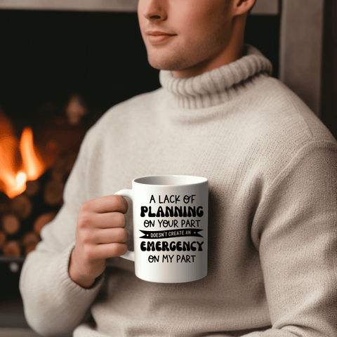 Introducing our exclusive coffee mug with a witty and assertive message: "A Lack Planning On Your Part Doesn't Create An Emergency On My Part." This cleverly crafted mug is not just a vessel for your favorite beverage; it's a statement piece that adds a touch of humor and personality to your daily routine.