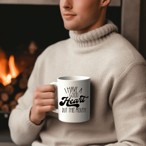 Express yourself with our charming "I Have a Good Heart But This Mouth" coffee mug. A perfect blend of humor and honesty to accompany your favorite beverages.