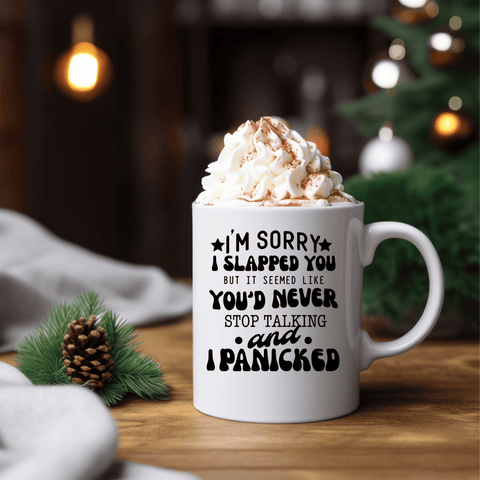 Order your "I'm Sorry I Slapped You But It Seemed Like You'd Never Stop Talking & I Panicked" mug today and let the laughter flow with every sip!