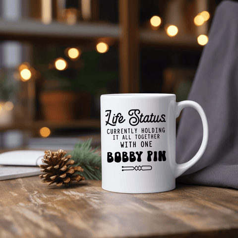 Embrace life's chaos with our exclusive "Life Status Currently Holding It All Together With One Bobby Pin" coffee mug. Sometimes, a touch of humor is all you need to navigate through the day!