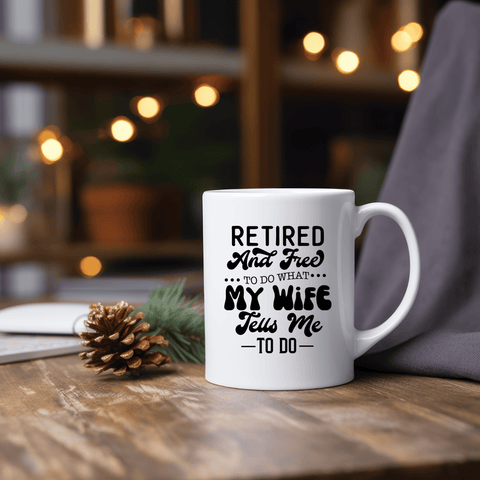 Embrace the joy of retirement with our exclusive coffee mug featuring the humorous message: "Retired And Free To Do What My Wife Tells Me To Do."