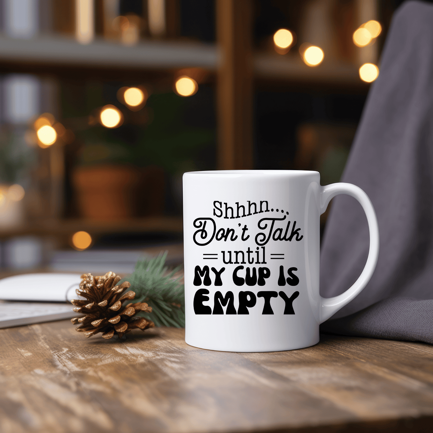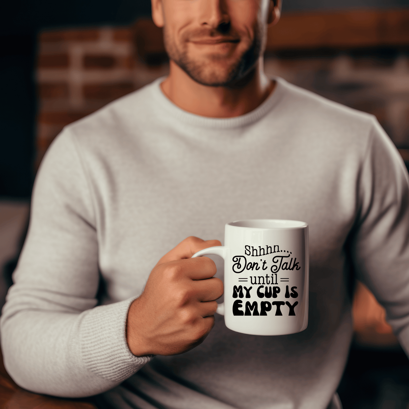 Introducing our exclusive coffee mug with the straightforward message: "Shh Don't Talk Until My Cup Is Empty."