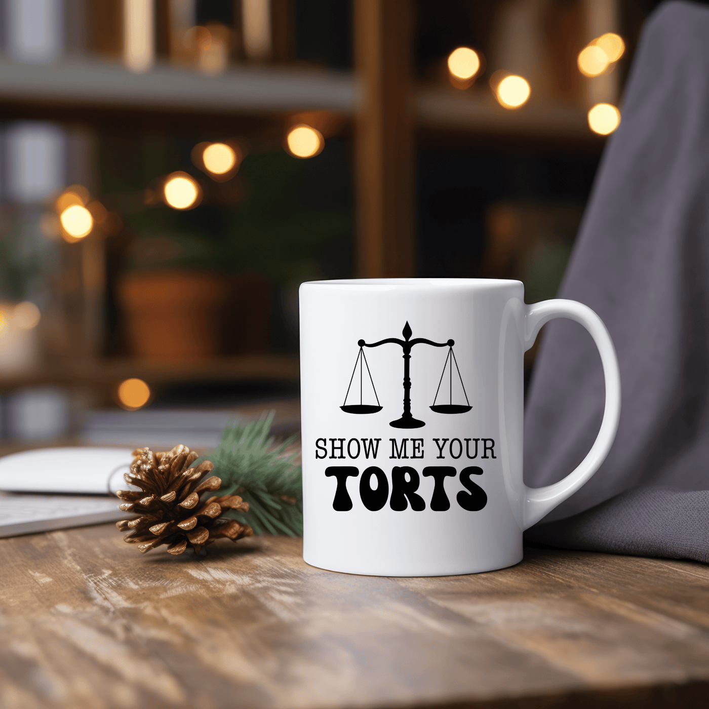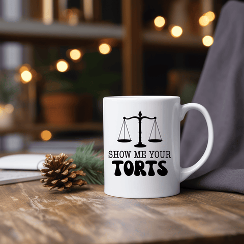 Add a touch of legal humor to your coffee breaks with our exclusive mug featuring the witty message: "Show Me Your Torts."