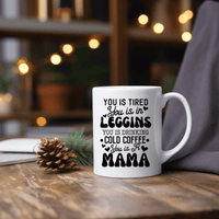 Celebrate the joys and challenges of motherhood with our exclusive coffee mug featuring the endearing message: "You Is Tired, You Is In Leggings, You Is Drinking Cold Coffee, You Is A Mama."