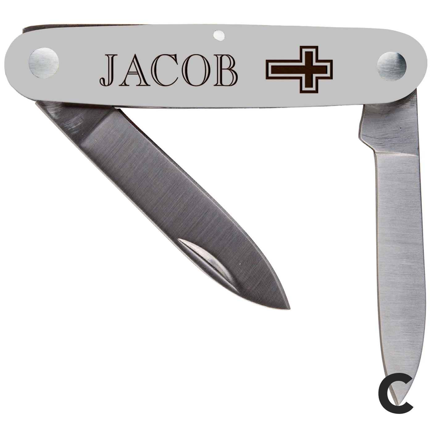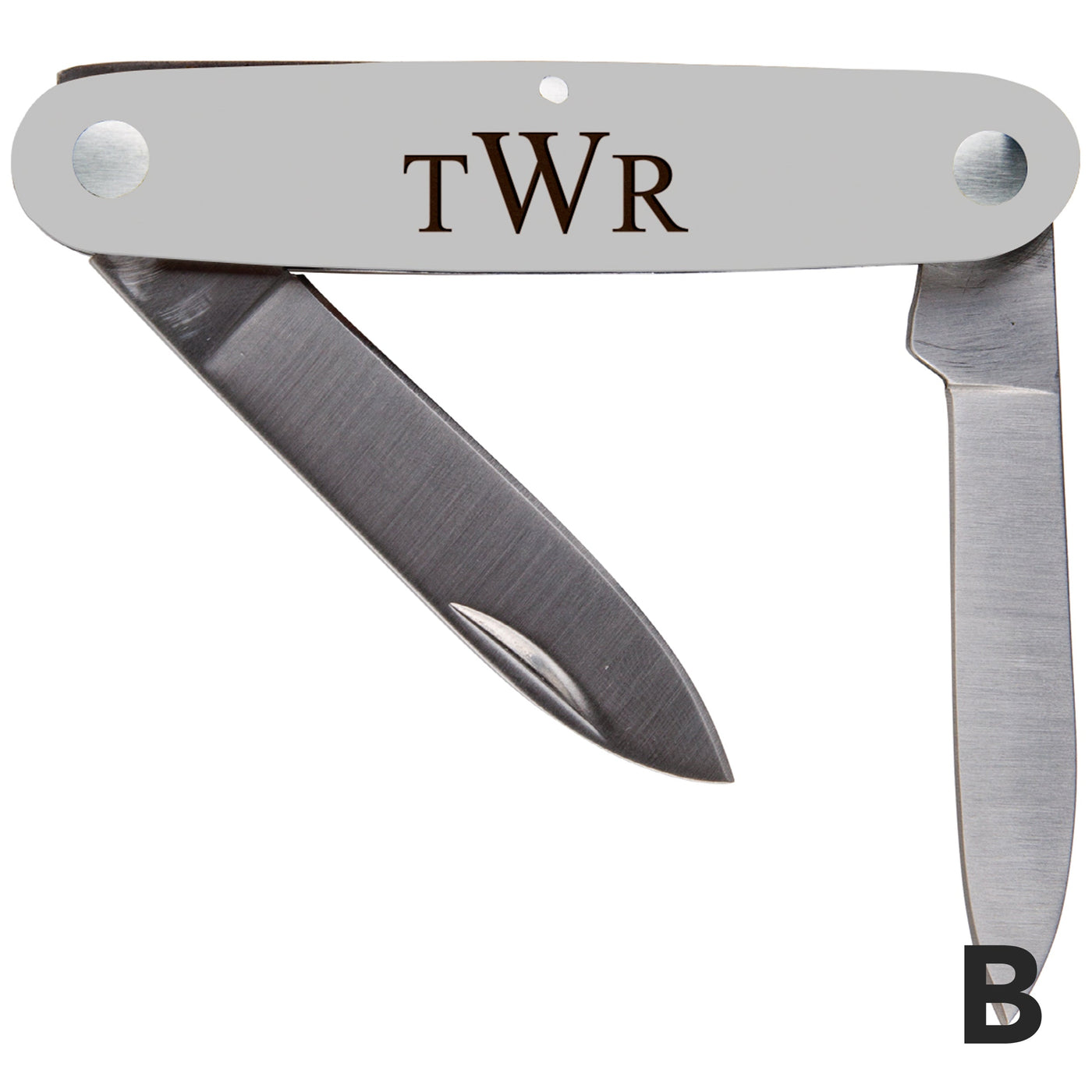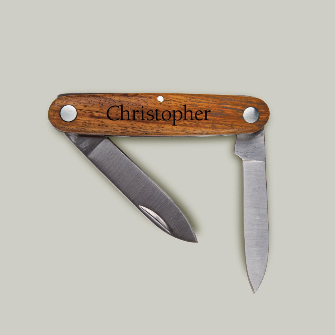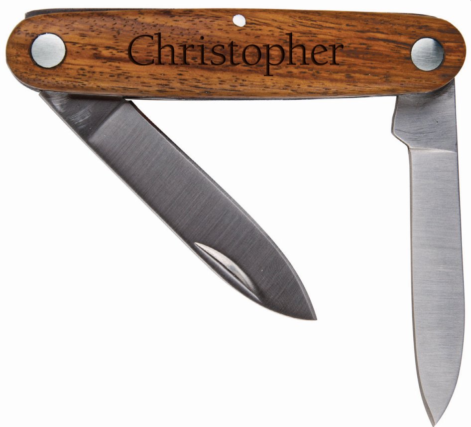 A pocket knife is a must-have tool, both on the job and off. Great for around the house, in the garage, and out in the wild. Personalize with a name, business, or sentiment. This pocket knife features a burl wood handle and 3.25" locking blade.