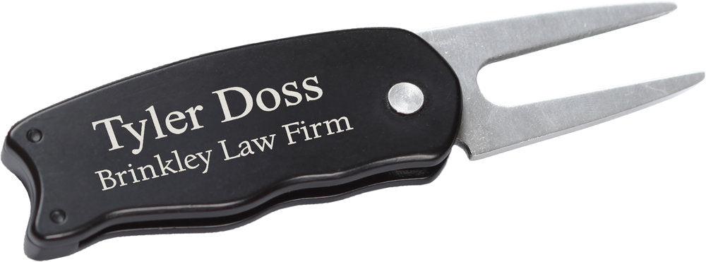 Sleek and functional, this personalized divot tool is the perfect golfing companion. Easily carry in a pocket of golf bag. Spring-loaded prongs snap into action for fixing course damages and fold up for storage. Features a magnetic, removable ball marker on side. Personalize tool with your name, initials or business.