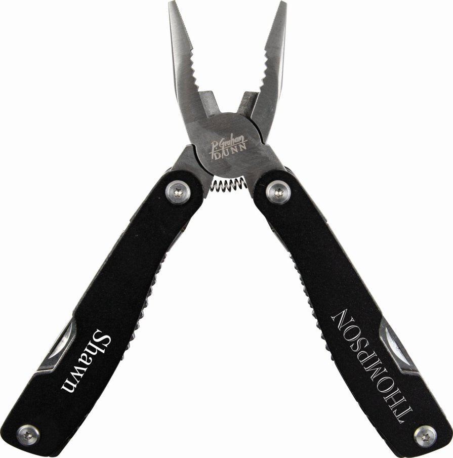 A multi-tool is a must-have for both on the job and off. Personalize with a name, business, or sentiment. This multi-tool features long nose pliers, regular pliers, wire cutter, saw, small, medium and large flathead screwdrivers, phillips head screw driver, a file, can opener, knife, fish scaler and a ruler.