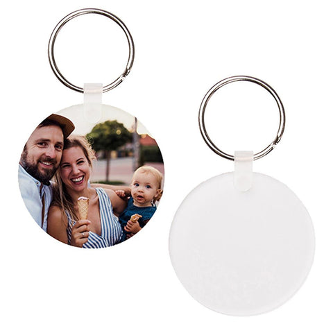 This single-sided hardboard round keychain is the perfect addition to your keyring, bookbag, or jacket zipper. Keyring and plastic tab included.