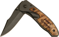 A pocket knife is a must-have tool, both on the job and off. Great for around the house, in the garage, and out in the wild. Personalize with a name, business, or sentiment. Features a burl wood handle, pocket clip, and black 2.5" locking blade.