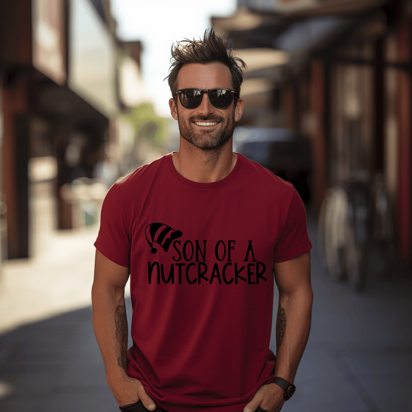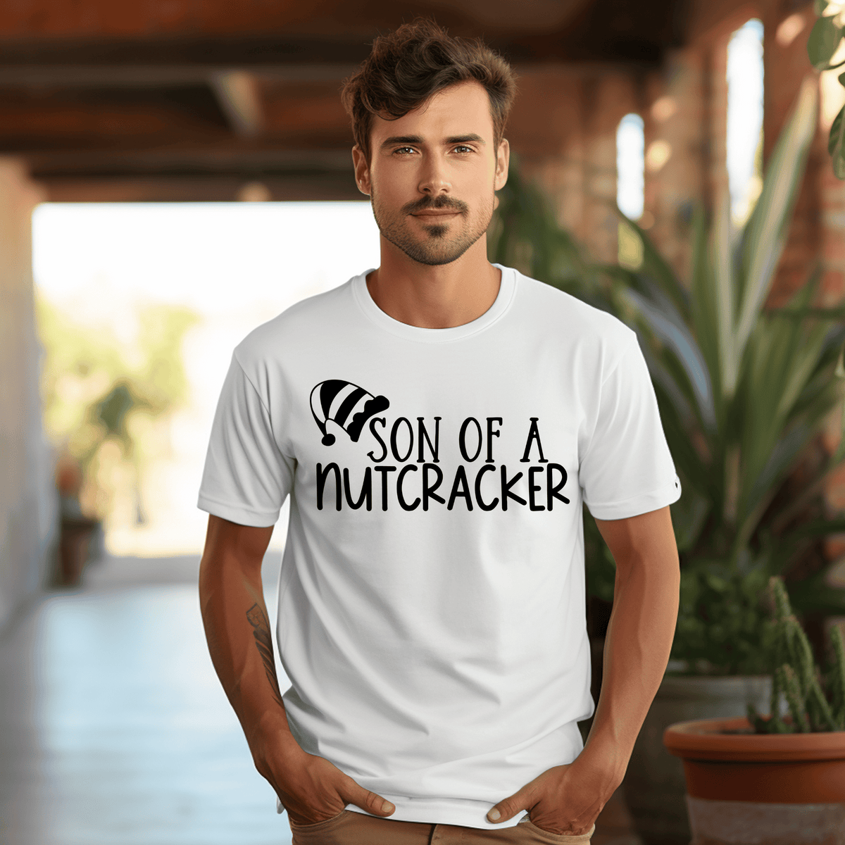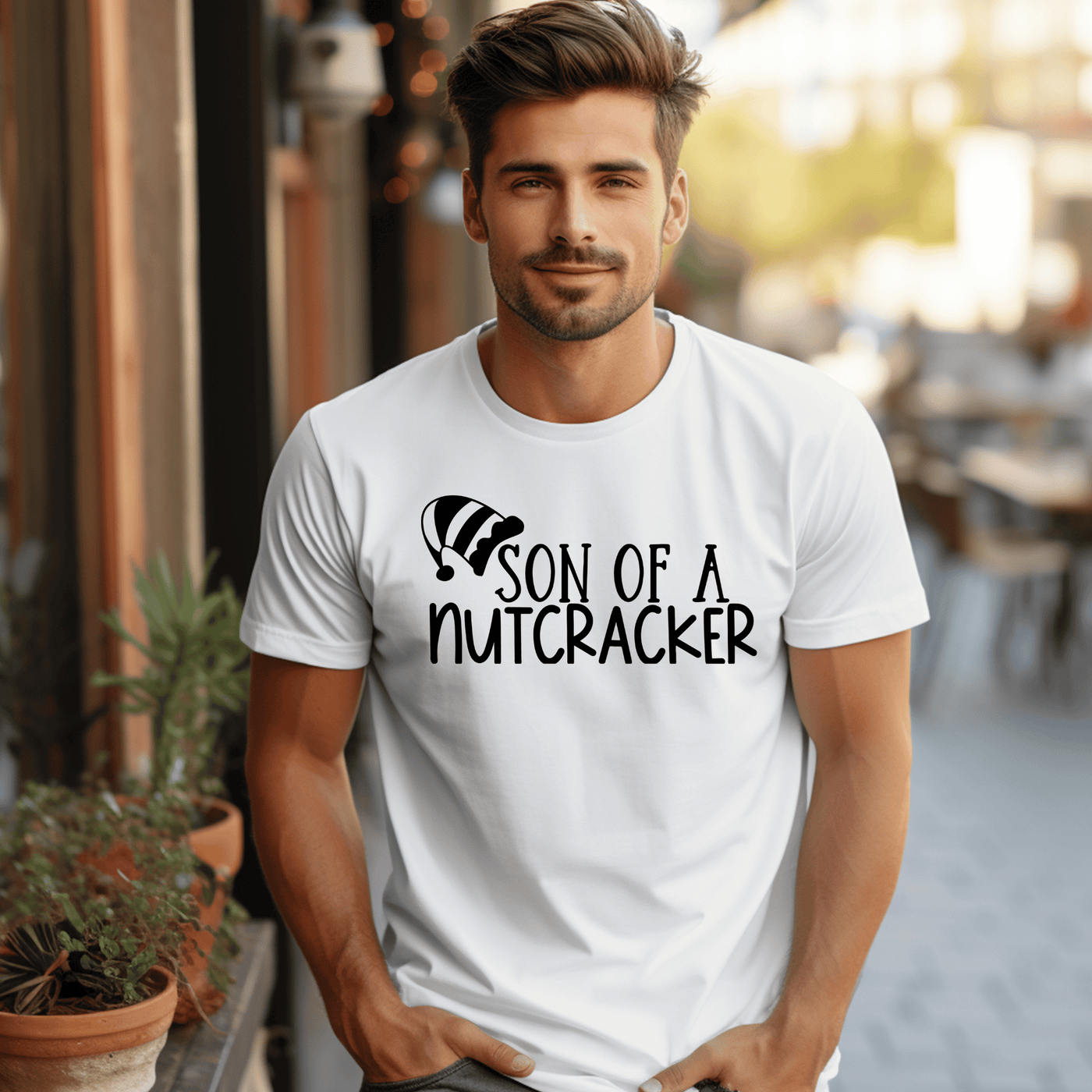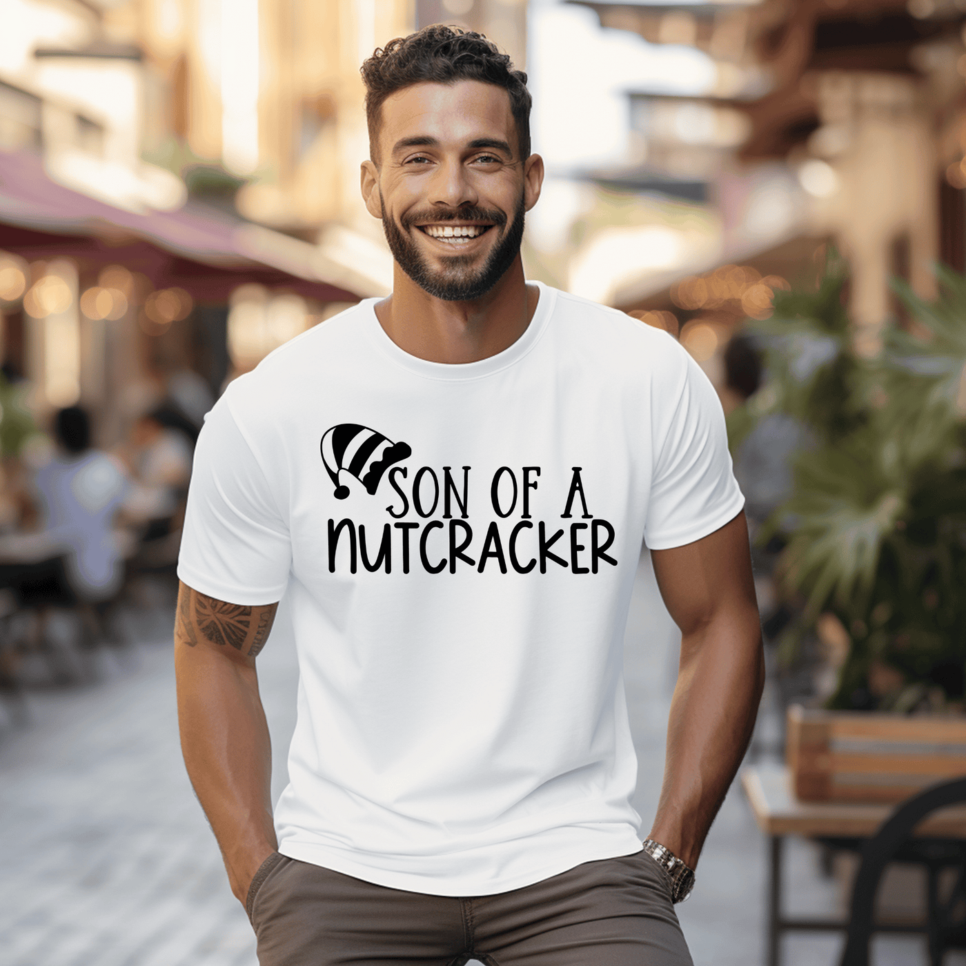 Elevate your holiday style with the "Son of A Nut Cracker" printed T-shirt. Order now and bring a smile to the season!
