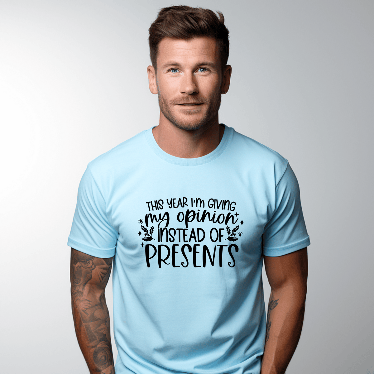 Upgrade your holiday wardrobe with our "This year I'm Giving My Opinion Instead of Presents" T-Shirt and let your style reflect the humorous side of the season!