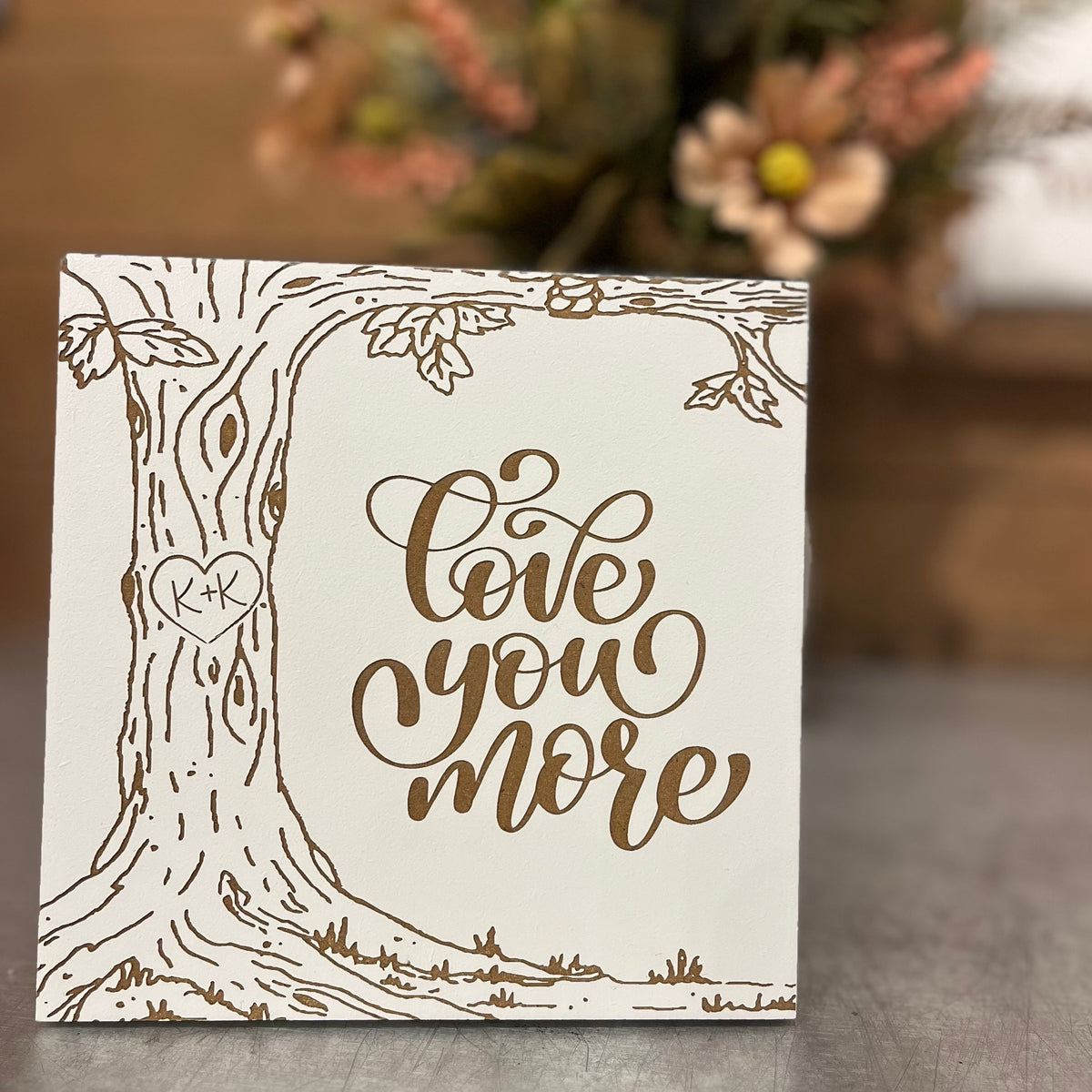 Simply add you + your significant other's initials into the "Text to Be Engraved" box, and our Laser Engraving Specialists will engrave them onto the tree alongside a "Love You More" message. Makes for a heartfelt, unique gift for your Valentine!