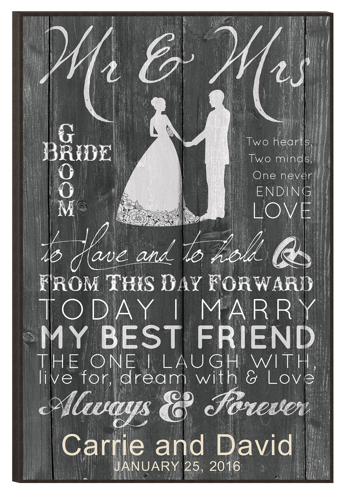 Make a simple yet sophisticated statement with this piece of art. Add a personal touch by including names, date, and sentiment. Makes for a perfect wedding gift.