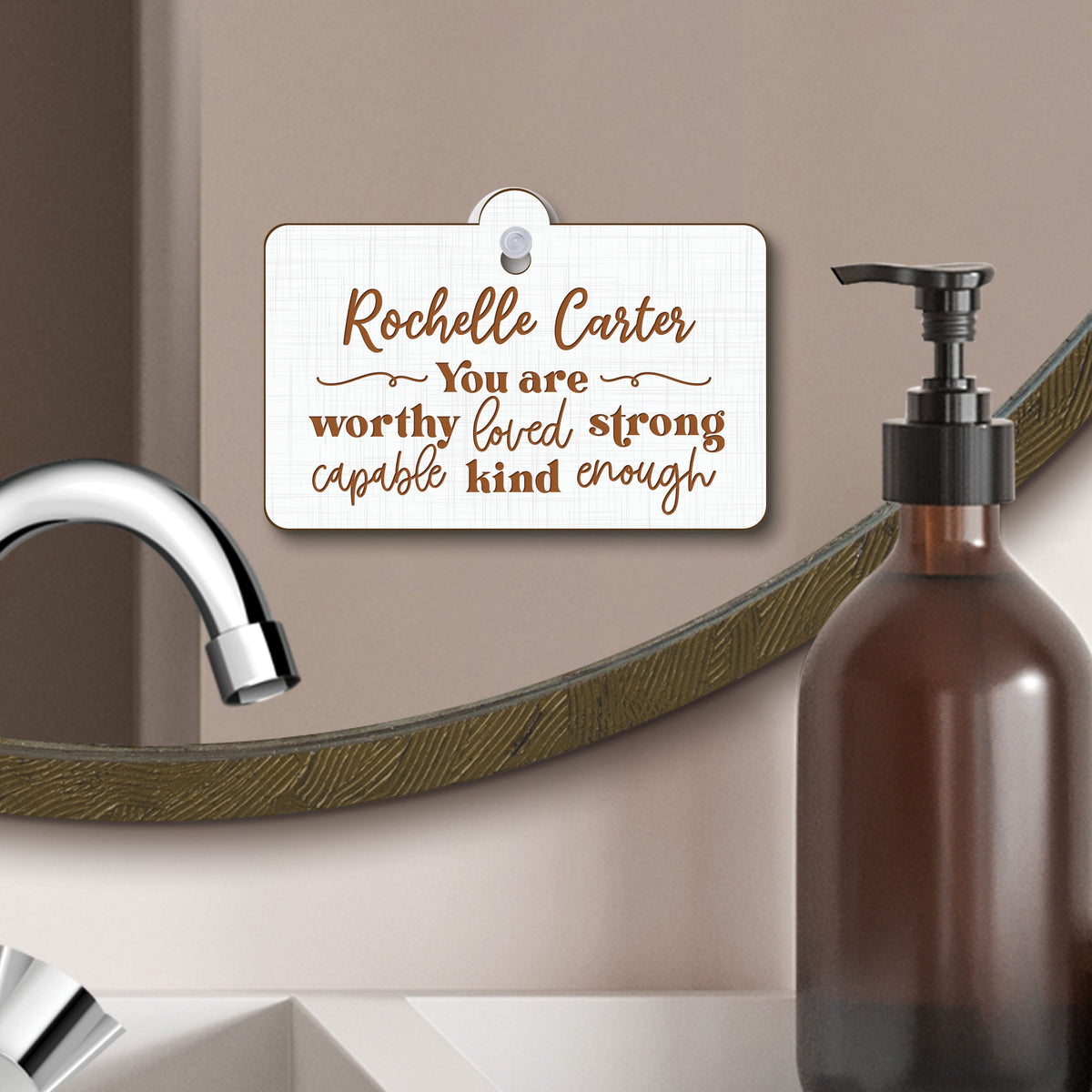 This small, decorative sign features your own unique sentiment or personalization. Use the suction cup to adhere to a bathroom mirror, kitchen backsplash, or bedroom window.