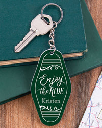 Shaped to resemble a vintage motel key tag, each of these key chains features bold colors, fun fonts, and your custom sentiment -- makes for a convenient and thoughtful gift. Using the key ring, easily attach to a set of keys or tote bag to add a personal touch.