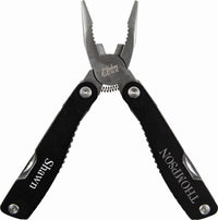 A multi-tool is a must-have for both on the job and off. Personalize with a name, business, or sentiment. This multi-tool features long nose pliers, regular pliers, wire cutter, saw, small, medium and large flathead screwdrivers, phillips head screw driver, a file, can opener, knife, fish scaler and a ruler.